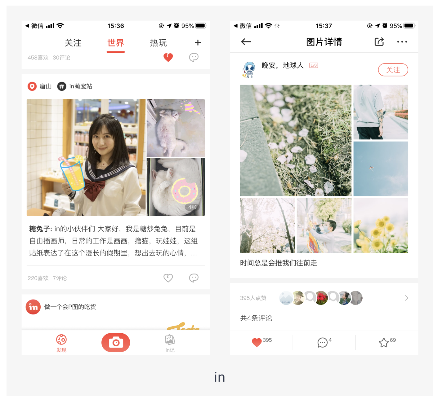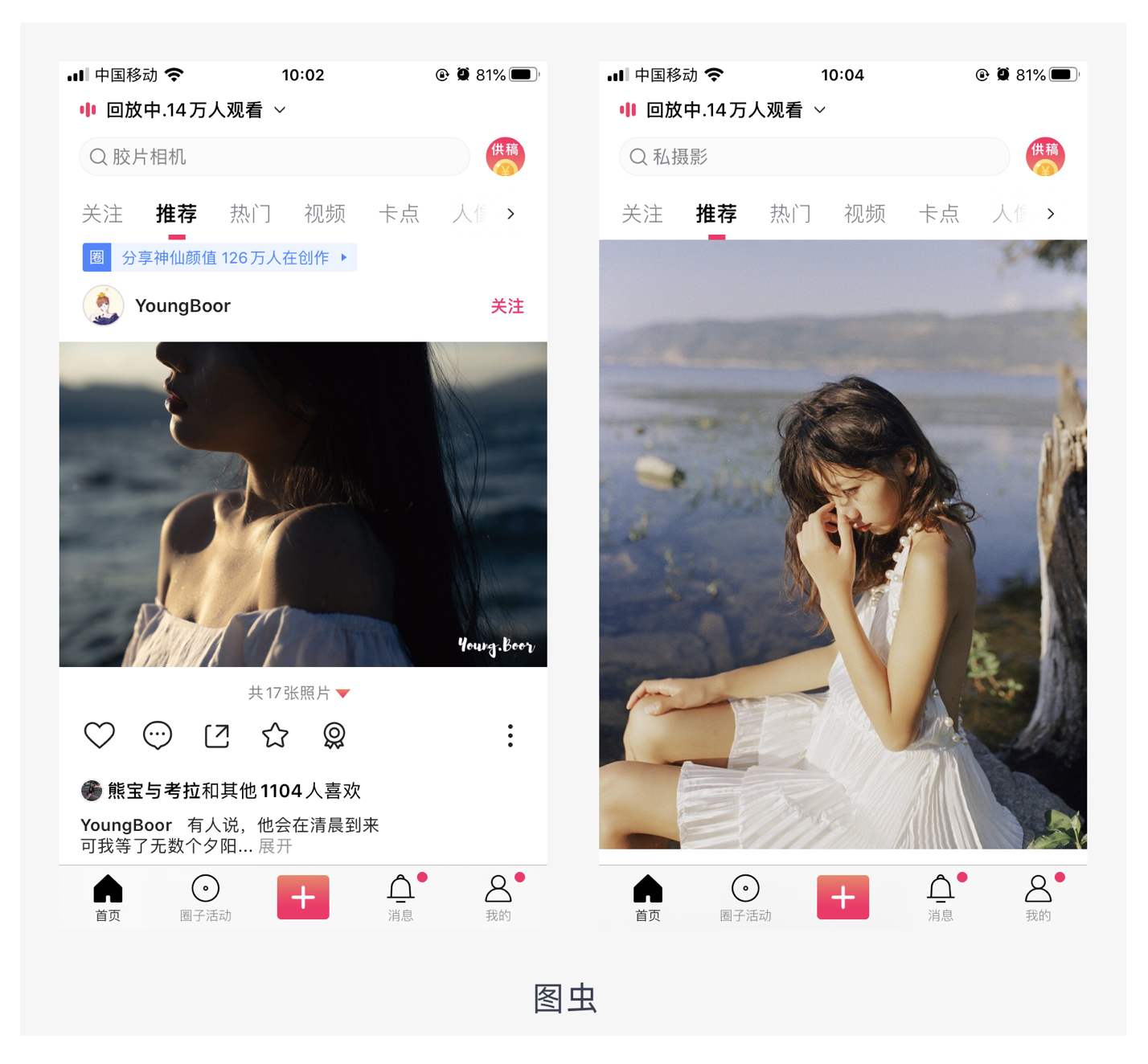 - 隨圖片而變化:當(dāng)用戶(hù)上傳不同比例的圖片時(shí),圖片展示寬度為屏幕寬度,展示高度根據(jù)確定的寬度等比例縮放。這種適配方式能將圖片信息表達(dá)完善,但圖片占用空間大,適合圖片質(zhì)量高、用戶(hù)以瀏覽圖片為主的產(chǎn)品,如圖蟲(chóng)。不過(guò)需要注意的是,采用該方式需要設(shè)置最大最小閾值,當(dāng)圖片的高度超過(guò)一定數(shù)值,高度就不再增加,當(dāng)圖片的高度小于一定數(shù)值,高度不再減小。