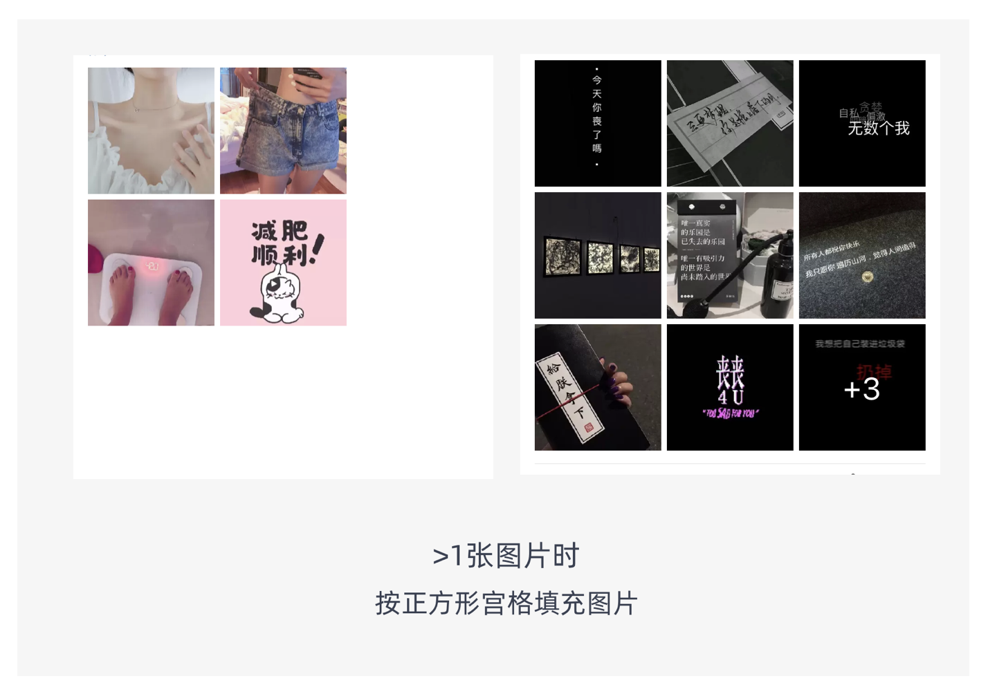 宮格式布局是指用戶(hù)上傳的圖片會(huì)適配到一個(gè)個(gè)的方格中,常見(jiàn)的排版有 3 宮格、6 宮格、9 宮格。它多應(yīng)用在社交類(lèi)的 APP 中或者電商 APP 的內(nèi)容社區(qū),如微博、微信、QQ 空間等社交 APP,以及淘寶等電商應(yīng)用的內(nèi)容社區(qū)。