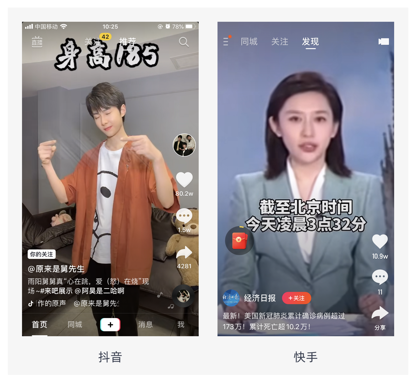 視頻性 Feed 流以短視頻為主(長(zhǎng)視頻占用用戶(hù)時(shí)間長(zhǎng),容易導(dǎo)致用戶(hù)缺乏耐心),搭配輔助文字。它的優(yōu)點(diǎn)是能滿(mǎn)足用戶(hù)在視覺(jué)和聽(tīng)覺(jué)上的感受,沉浸式體驗(yàn)好,更加容易吸引用戶(hù)的注意力,一般情況下會(huì)主動(dòng)且循環(huán)播放,畫(huà)面占滿(mǎn)全屏,如快手、抖音、微視等。不過(guò),它也存在缺點(diǎn),占用空間大,展示內(nèi)容少,而且需要緩存,對(duì)網(wǎng)絡(luò)質(zhì)量要求高。