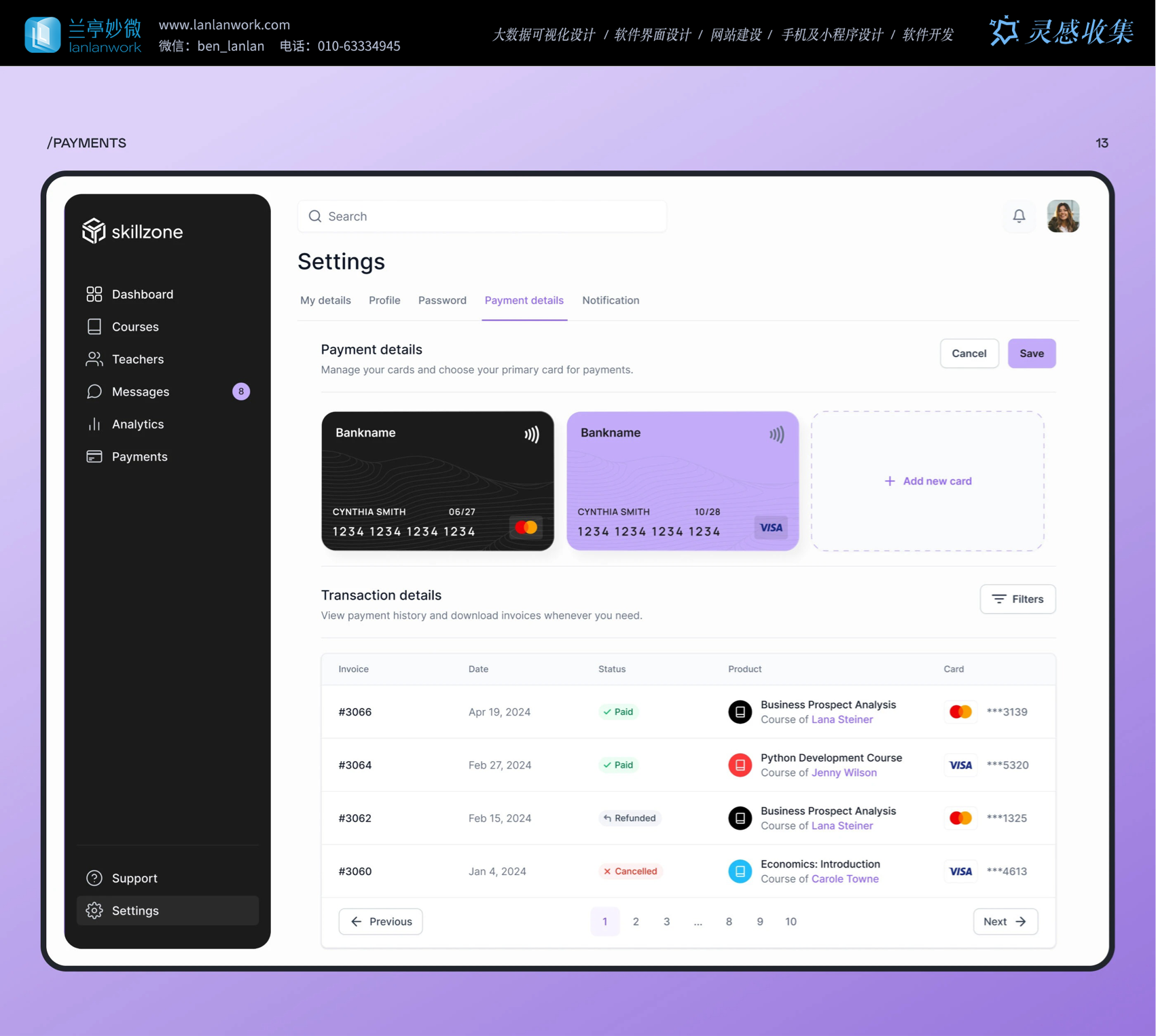 師)" 等功能,老師和學生能一鍵直達想去的板塊。主內容區(qū)按功能模塊化,比如支付頁面,銀行卡信息用卡片