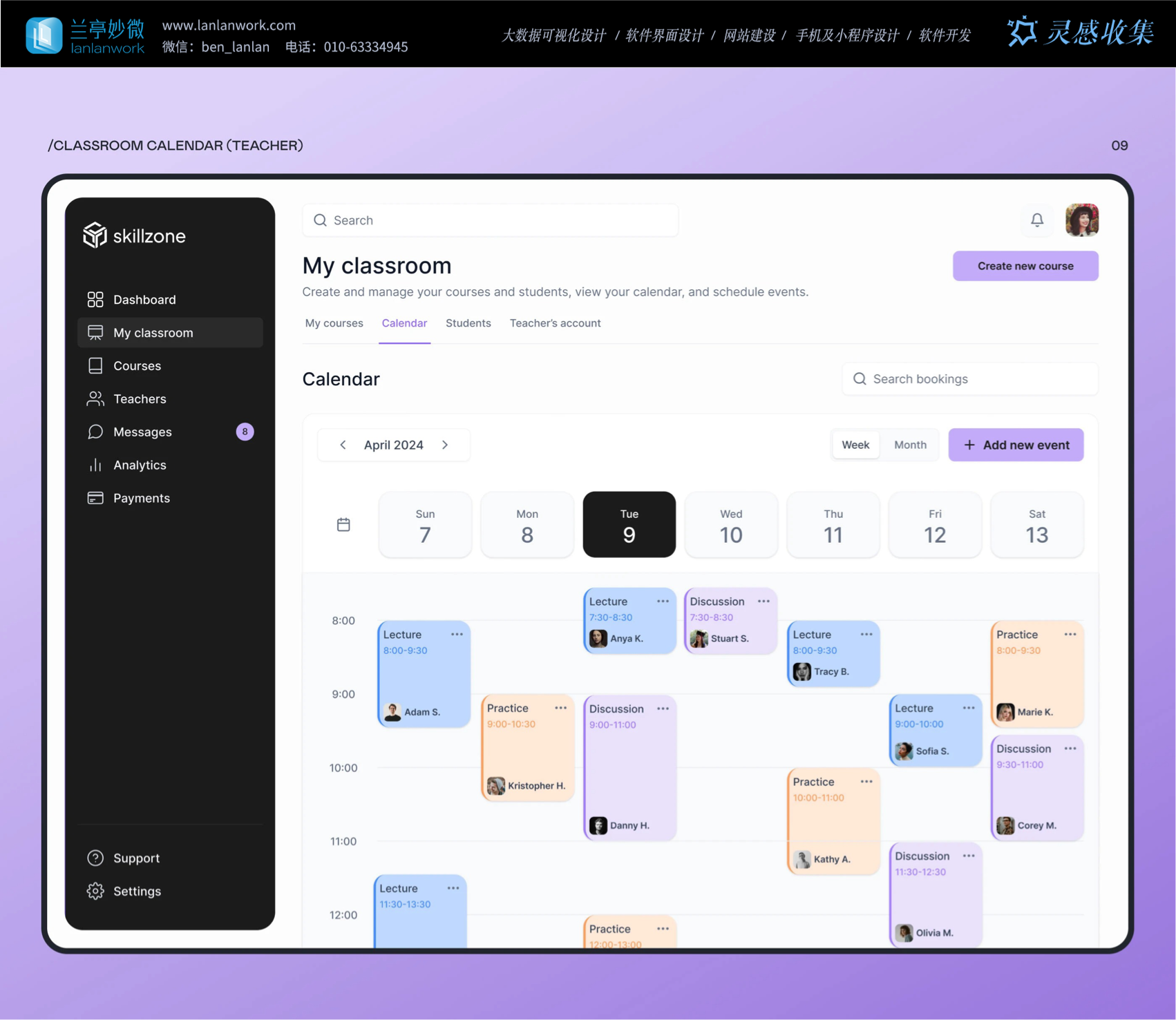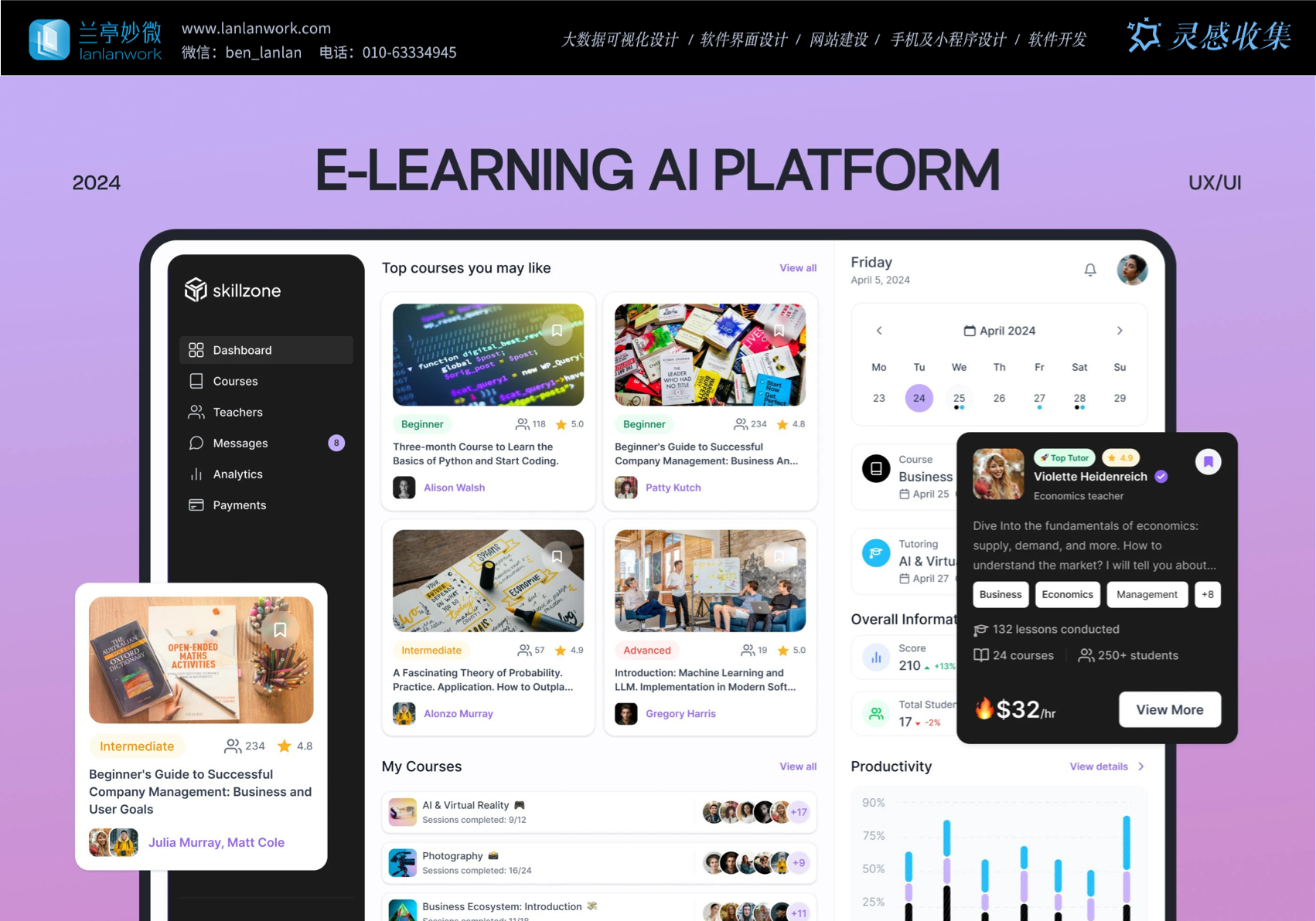 Skillzone 選用柔和的紫色為主色調,紫色常給人智慧、有創(chuàng)造力的的感覺,很符合教育的特點。再搭配簡潔的黑白