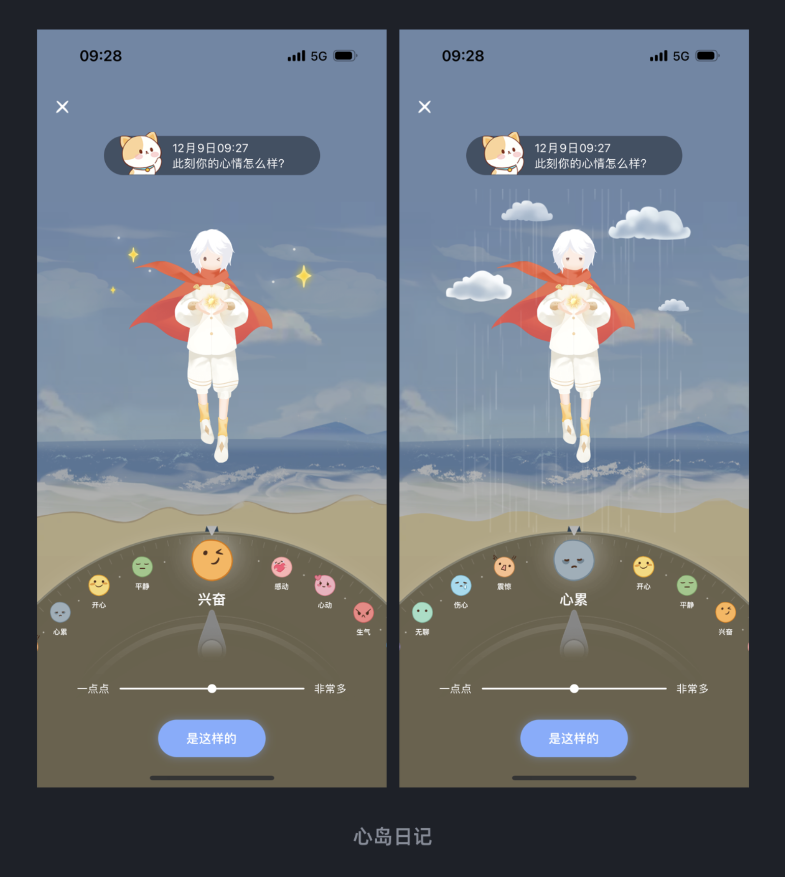 心情記錄類產(chǎn)品的核心是 “降低記錄門檻,強(qiáng)化情感共鳴”,心島日記的轉(zhuǎn)盤式心情記錄設(shè)計(jì)完美實(shí)現(xiàn)了這一點(diǎn)。用戶無需輸入文字,只需轉(zhuǎn)動(dòng)轉(zhuǎn)盤,就能選擇 “開心”“平靜”“心累” 等心情狀態(tài),還能通過 “一點(diǎn)點(diǎn)”“非常多” 的強(qiáng)度調(diào)節(jié),精準(zhǔn)傳遞當(dāng)下感受。