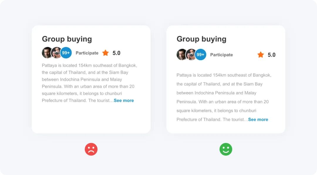 一個(gè)卡片內(nèi)通常會(huì)包含圖片、標(biāo)題、詳細(xì)介紹及行動(dòng)按鈕等元素,這些元素需要以聚焦的形式去呈現(xiàn),以幫助用戶快速掃描內(nèi)容。當(dāng)文本內(nèi)容較長(zhǎng)、展示的信息過多時(shí),不利于用戶快速掃描,導(dǎo)致用戶無法在第一時(shí)間快速感知到產(chǎn)品想要展示的、或用戶想要知道的信息,很容易被用戶過濾。