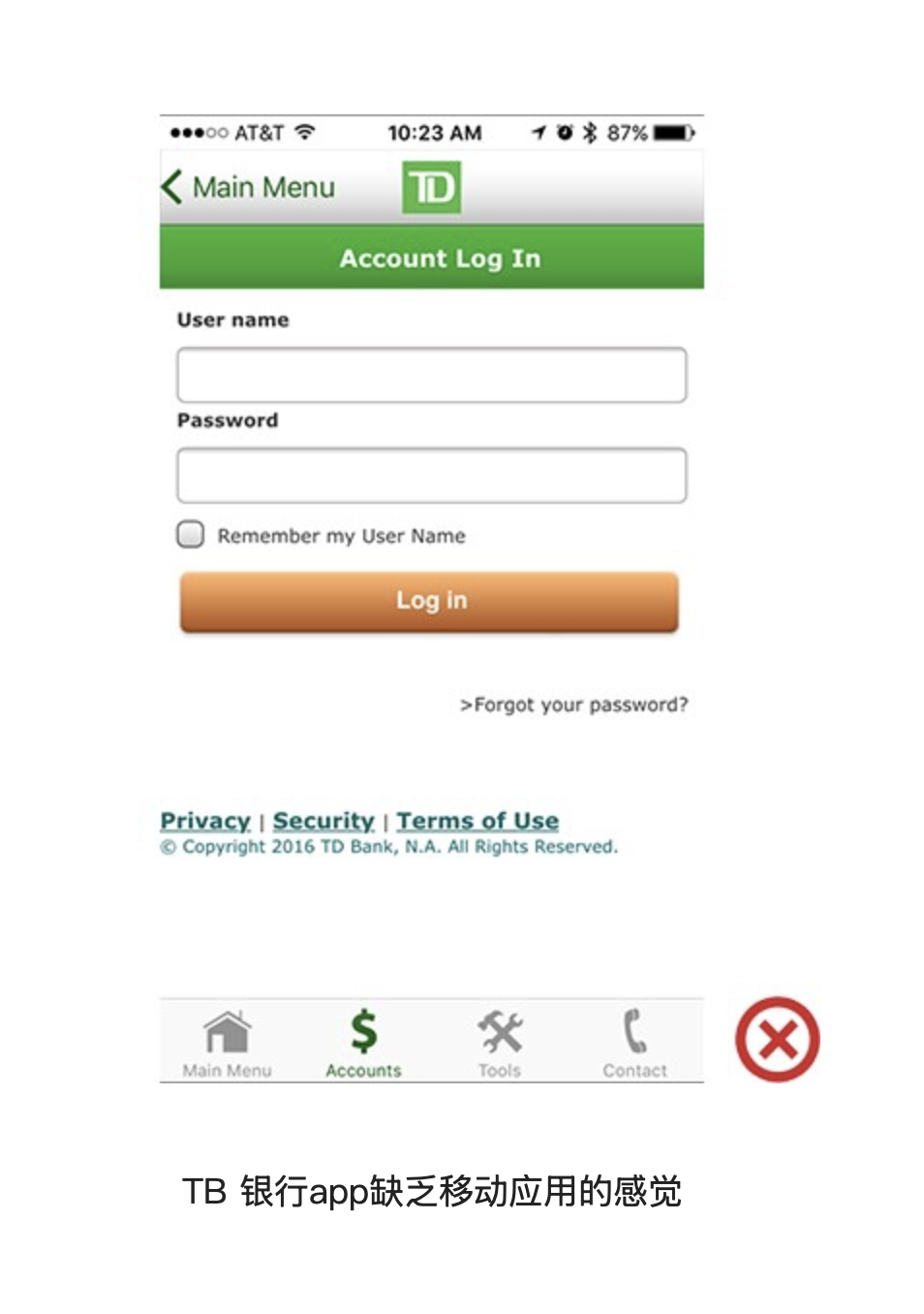 網(wǎng)頁端的交互模式與頁面元素,并不完全適用于移動(dòng) App。網(wǎng)頁中常用下劃線表示超鏈接,但在移動(dòng)應(yīng)用中,用戶更習(xí)慣通過按鈕完成跳轉(zhuǎn),下劃線設(shè)計(jì)會(huì)顯得突兀且不符合使用預(yù)期。曾有某銀行的 iOS 端 App,直接將網(wǎng)頁代碼包裝成應(yīng)用,界面中保留了網(wǎng)頁式的下劃線鏈接和底部版權(quán)信息,讓用戶誤以為打開的是移動(dòng)網(wǎng)頁,而非原生 App,嚴(yán)重影響了產(chǎn)品的專業(yè)性與使用體驗(yàn)。