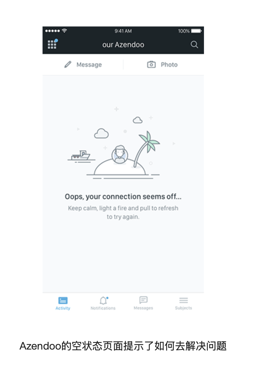 空狀態(tài)、錯(cuò)誤提示頁面不應(yīng)是毫無指引的空白界面。當(dāng)用戶遇到網(wǎng)絡(luò)斷開、操作失誤或內(nèi)容為空時(shí),空白頁面會(huì)讓用戶不知所措,甚至直接退出 App。優(yōu)秀的空狀態(tài)設(shè)計(jì)應(yīng)提供明確的解決方案 —— 比如告知用戶 “網(wǎng)絡(luò)連接失敗” 后,給出 “下拉刷新重試” 的指引;內(nèi)容為空時(shí),建議用戶 “添加第一條內(nèi)容” 并提供操作入口。某協(xié)作類 App 在網(wǎng)絡(luò)斷開時(shí),會(huì)顯示 “連接似乎中斷了... 冷靜下來,下拉刷新再試一次” 的提示,既緩解了用戶的焦慮,又給出了具體操作路徑,有效降低了用戶流失率。